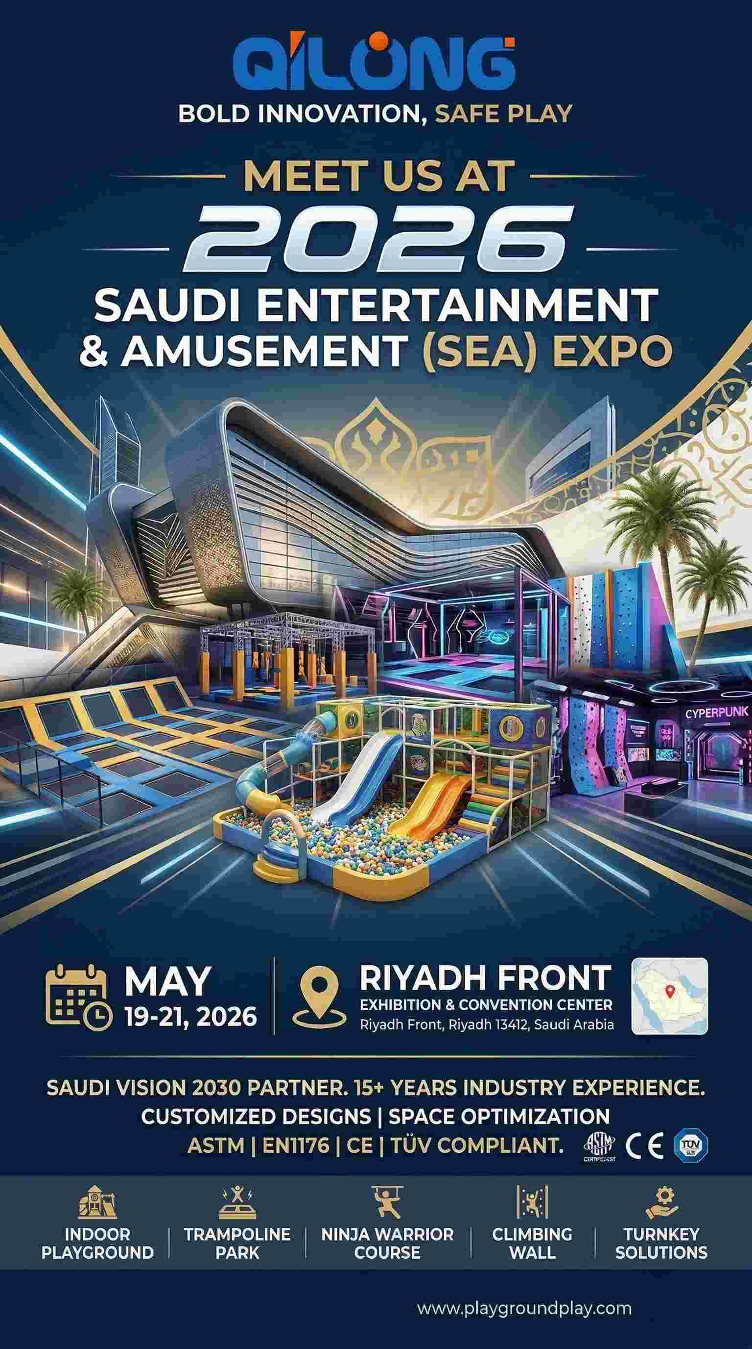 Эр-Рияд, Саудовская Аравия — Компания Qilong Amusement Group (Playgroundplay), ведущий мировой производитель высококачественного оборудования для развлечений в помещениях, с радостью объявляет о своем участии в долгожданном мероприятии. Саудовская выставка развлечений и аттракционов (SEA Expo) 2026.